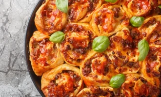 - সুলুগুনি পনির গ্রেট করুন, ডিমের সাথে মিশিয়ে চারটি বল তৈরি করুন। তাদের প্রতিটি ময়দার মধ্যে মোড়ানো, প্রান্ত চিমটি এবং একটি স্তর মধ্যে রোল।
